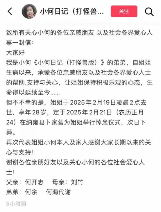 小何的生命虽然短暂,但她用自己的经历告诉我们:面对困境,我们要保持乐观和坚强。即使身处绝境,也不要轻言放弃。她的故事,就像一盏明灯,照亮了无数正在与病魔抗争的人的前行之路。