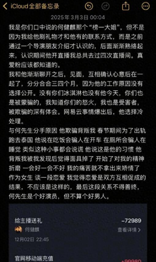 近日,男演员何健麒深陷舆论漩涡,起因是一位自称是他直播间“榜一大姐”的网友在网络上发布的爆料。该网友声称与何健麒曾是恋人关系,并晒出高额打赏记录和照片作为证据,指控何健麒存在劈腿和经济纠纷等行为。这一事件迅速引发广泛关注,何健麒的公众形象面临严峻挑战。