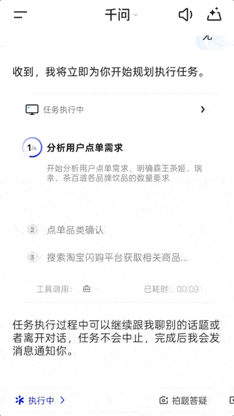 在确认你有无特殊的口味需求之后,它便开始马不停地自动跑完接下来的所有流程,包括分析用户点单需求、核对点单数量、以及搜索并获取购物平台(这里是淘宝闪购)商品信息。随着一系列内外部信息被它吸收消化,紧接着会进入到制定最佳点单方案的环节。