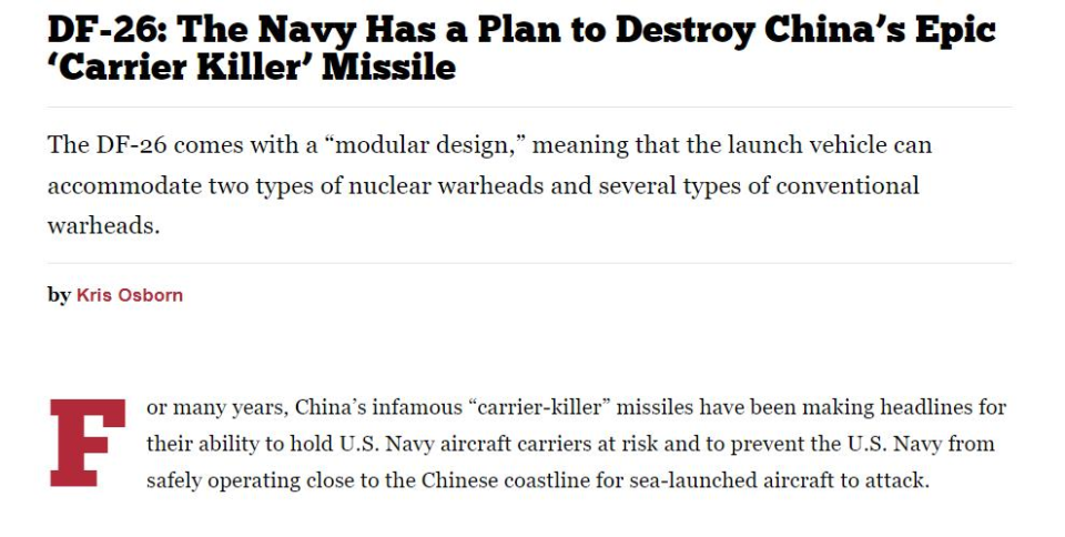 近日,《国家利益》杂志发表了一篇题为“美国海军有计划摧毁中国史诗般的航母杀手导弹—东风-26”的文章,文中透露美军正试图寻找应对东风-26的有效方法。