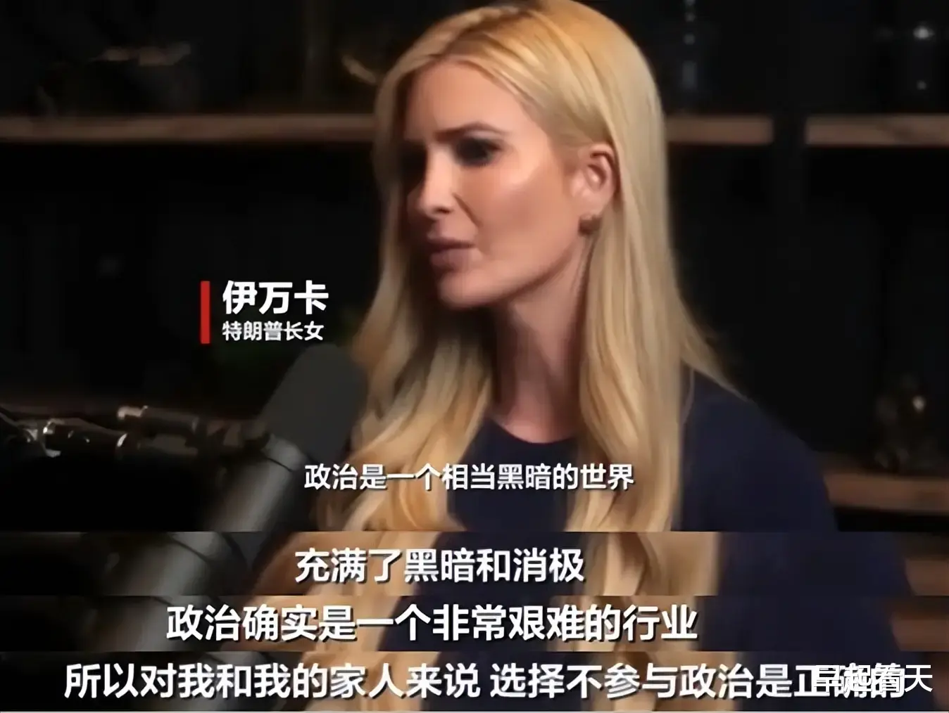 伊万卡曾在一档播客节目中首次披露了从政的真实感受,她认为政治是一个黑暗的世界,充满了暗流和消极因素。这种感受可能让她对政治产生了厌倦和反感。