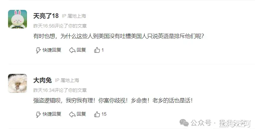 “有时也想,为什么这些人到美国没有吐槽美国人只说英语是排斥他们呢?”