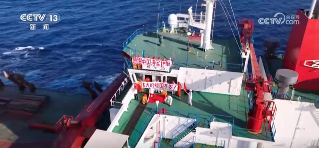经过2个多昼夜、580余海里的航行,护航编队安全抵达亚丁湾东部某海域解护点。分航之际,“振华35”号船员在船舷一侧展开“伟大的祖国万岁”“感谢中国海军护航”横幅,挥舞五星红旗,向祖国军舰表达感激之情。(央视)