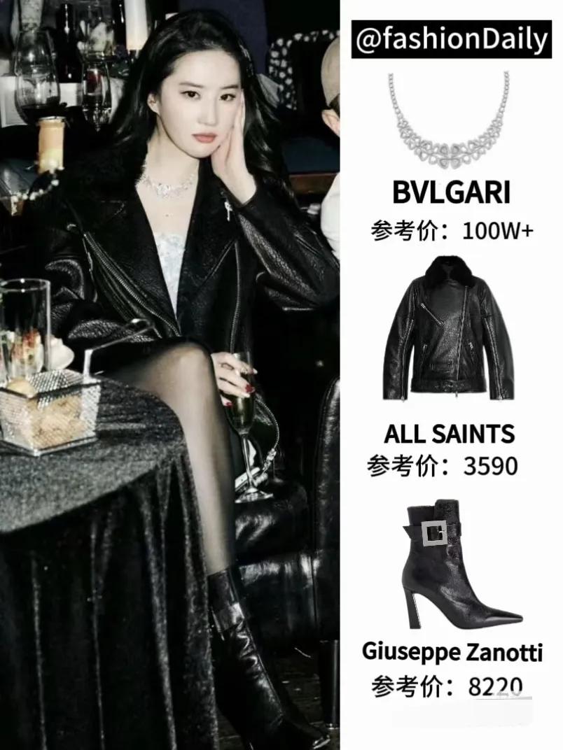 刘亦菲在当晚的穿着也可圈可点,一身酷酷的黑皮夹克搭配性感黑丝,内搭是一件亮片短裙,酷飒与性感兼具,很有反差感!她一手扶面一手摇香槟酒,定定看向镜头的样子,自如诠释什么叫“天生大明星”。