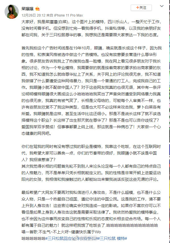 “眯眯眼”事件爆发之后,其实不只三只松鼠官方出来道歉解释,连模特本人也发表了自己的疑惑和委屈,模特本身就是长这个样子的,确实也很难跟本人扯上过多关系。