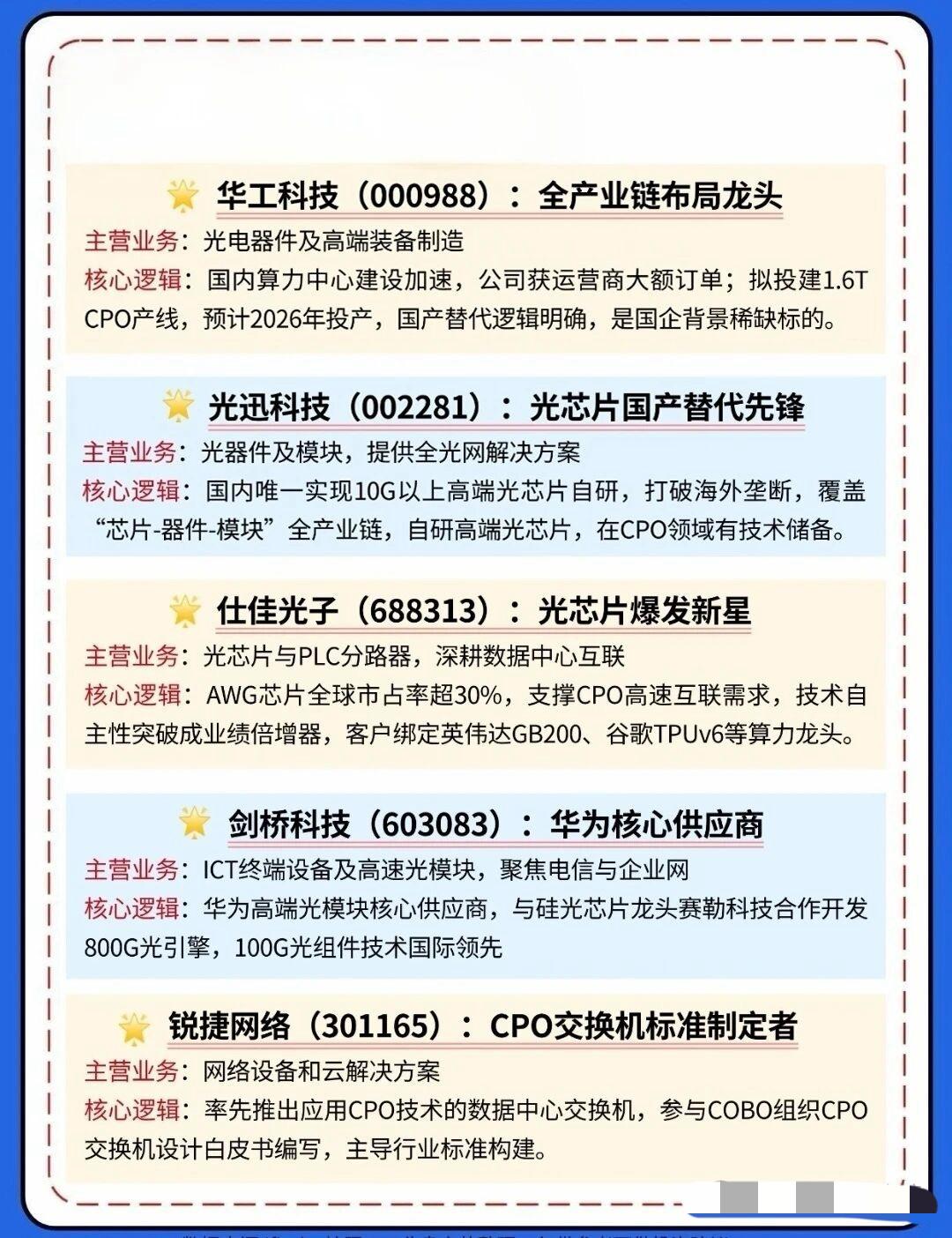 仕佳光子:这家公司在一种叫AWG的芯片上全球领先,这种芯片是CPO实现高速互联的关键。它已经进入了英伟达GB200等高端算力系统的供应链,爆发力很强。