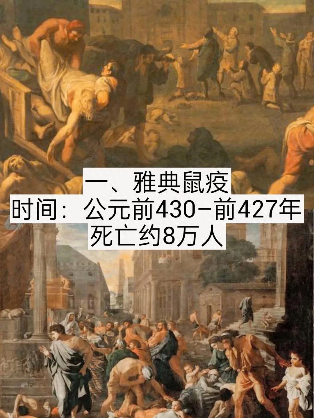 公元前430~前427年,在雅典人的比雷埃夫斯海港。开始有人发烧、眼睛变红、发炎,甚至舌头或喉咙开始渗血,导致呼吸困难、胸部、腹部疼痛等等症状,坚持七八天,很多人会出现肠道溃烂、腹泻等症状,最终脱力而亡。刚开始没当回事,随着乌泱乌泱的人感染,墙角水沟旁遍布尸体。一度怀疑是斯巴达人混进来投的毒。可是查来查去,病魔没有停止。时逢夏季,高于后世平均水准的39-40度热浪席卷雅典全城。人群聚集,牲畜人类水源交叉污染,被病魔折磨受不了的人纷纷跳入河中,试图减轻痛苦,可是无济于事,反而加速了病毒的传播。病毒迅速席卷了雅典所有的城邦。