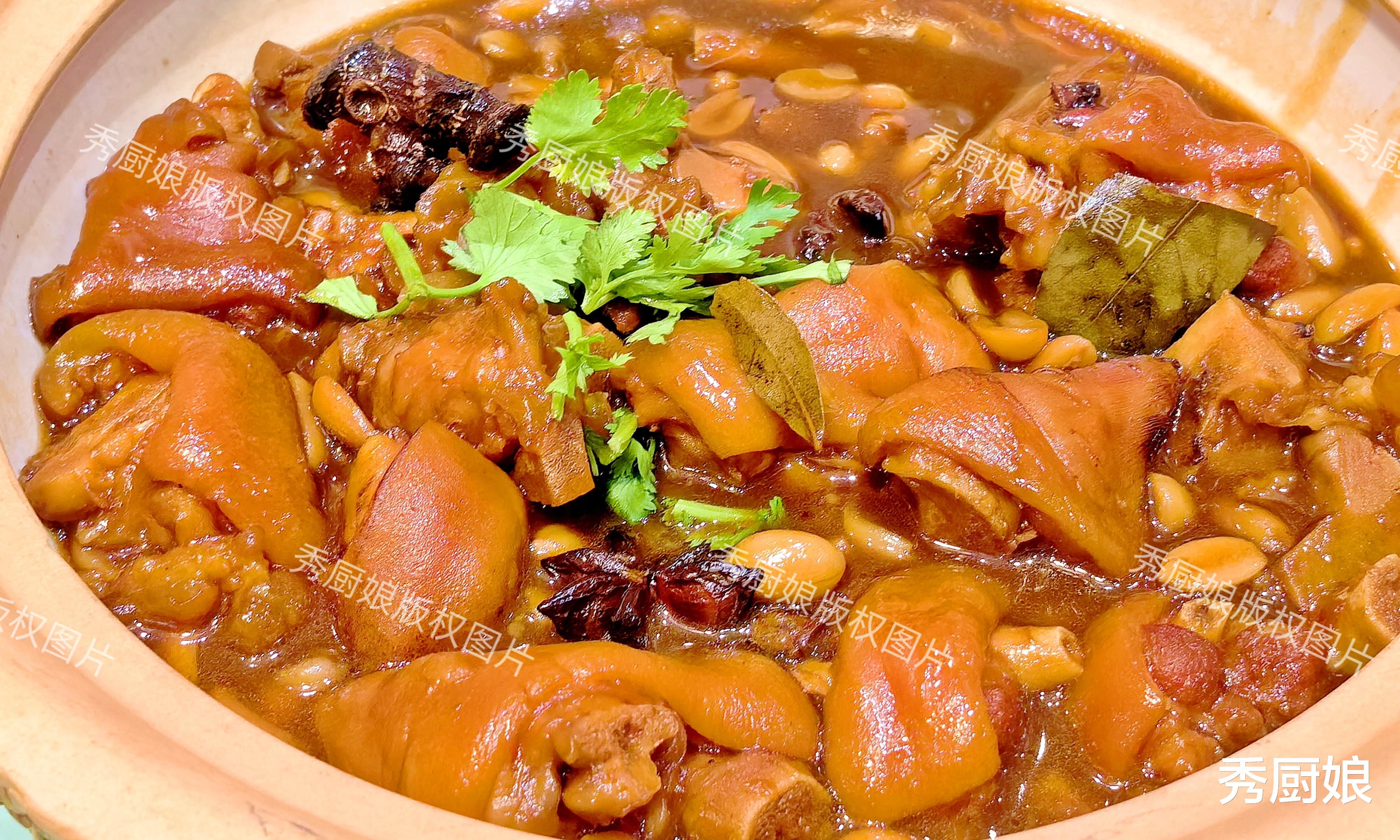 猪蹄富含胶原蛋白,能有效改善皮肤松弛现象,增加皮肤的弹性。花生米中富含维生素E和植物油脂,有助于滋养肌肤。这道菜口感浓郁,炖煮后的猪蹄入口即化,非常适合女性日常食补,尤其是帮助缓解皮肤干燥和皱纹问题。