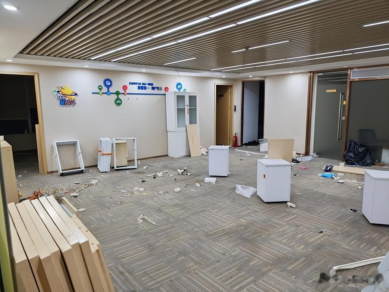 办公室大门敞开,里面几乎被搬空,只剩几个空柜子和零散杂物,前台原本的“金雅福”字样早就被摘掉,只留下模糊的痕迹。