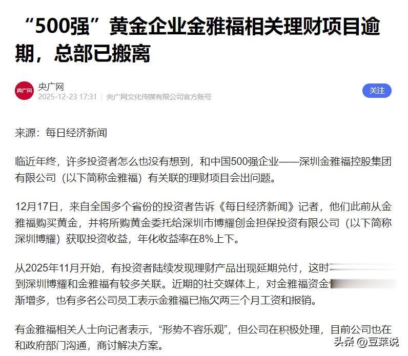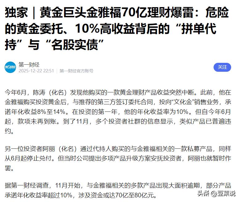 70亿黄金理财爆雷!2025年12月,一则“黄金理财爆雷”的消息在投资人群里传开了,涉及金额高达70到80亿元,主角是曾经的黄金巨头金雅福集团。