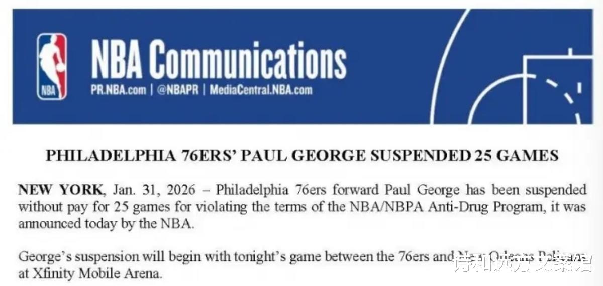 从午夜开始,费城球迷经历了从期待到震惊的情绪转折。过去几天,人们还在揣测密尔沃基雄鹿队的字母哥交易传闻,76人却等来了更不想面对的新闻。2月1日,NBA官方宣布,因违反联盟禁药政策,76人前锋保罗乔治将被禁赛25场。这消息打破了本赛季所有罚单记录,也让球队刚回暖的势头戛然而止。