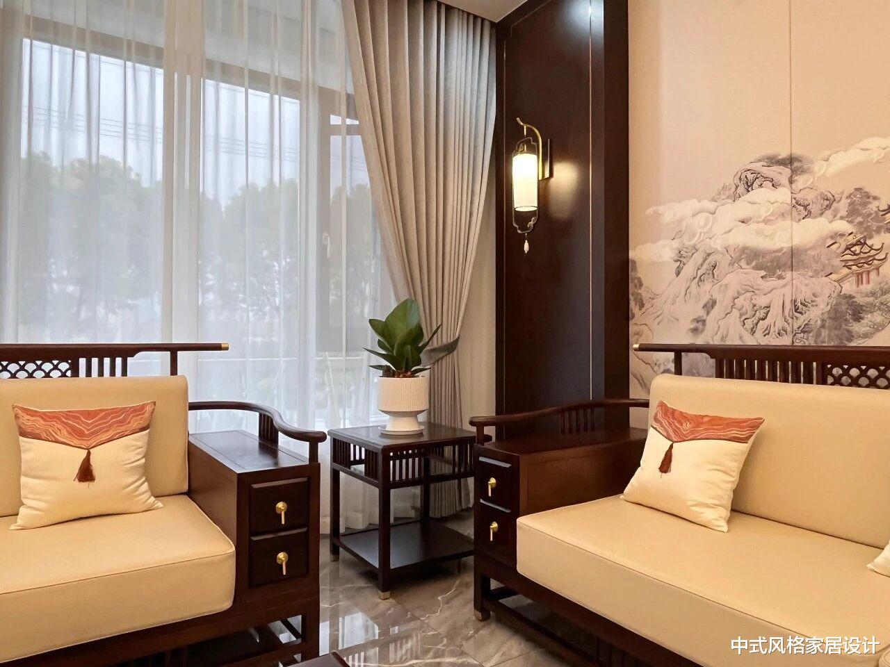 新中式客厅,整体设计融合传统韵味与现代简约。新中式家具:深色实木框架搭配米色软垫,线条流畅,两侧对称摆放,中间配深色茶几,上置水果与书籍。背景墙为水墨山水画,左侧落地窗配浅灰色纱帘,右侧深色木门旁有白色瓷瓶插紫色花卉。顶部悬挂多灯头吊灯,暖光与自然光交织,营造雅致温润氛围。