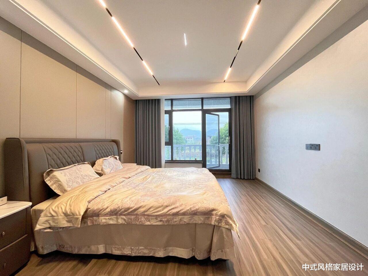 卧室,整体以浅米色与原木色为主色调,营造温馨雅致的休憩氛围。中央为双人床,铺浅色花纹床品,搭配深棕色软包床头,线条简洁。床侧是灰色抽屉式床头柜,柜面整洁;天花板嵌入线性灯带与筒灯,光线柔和均匀。地面铺设浅色木地板,与墙面同色系护墙板衔接,色调统一;窗帘半掩,自然光与室内灯光交融,凸显现代简约的利落与舒适。
