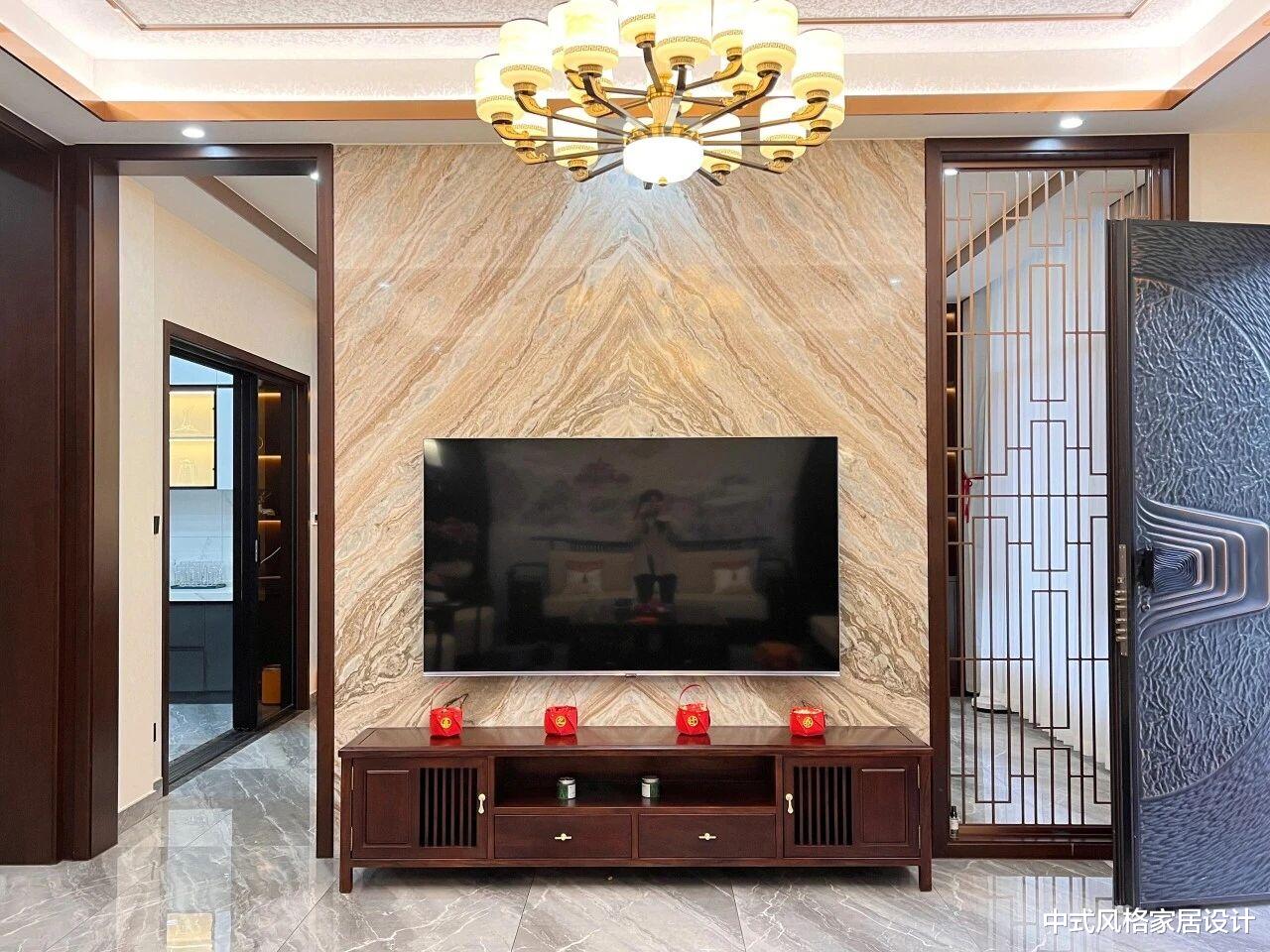 电视背景墙为大理石材质,纹理自然流畅,中央悬挂平板电视,下方配深色木质电视柜,右侧是竖条纹镂空隔断,顶部悬挂多灯头金色吊灯,灯光柔和洒落。地面铺浅色大理石地砖,与墙面色调和谐统一,展现传统与现代融合的雅致空间气质。