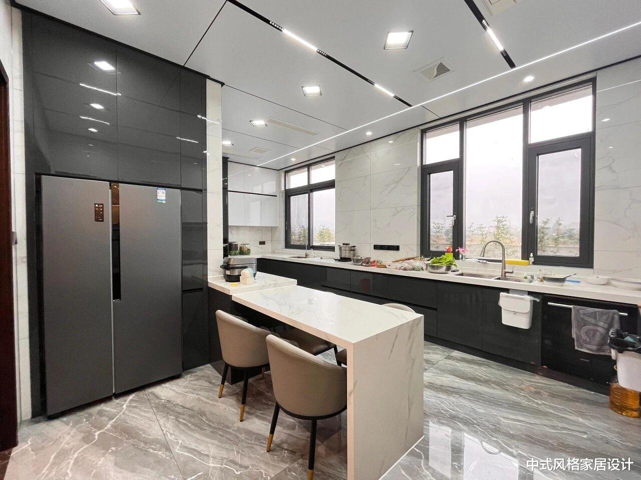 厨房,整体以黑色哑光橱柜为基底,搭配白色大理石台面与浅灰色水磨石地面,冷暖色调平衡。左侧嵌入式银色不锈钢冰箱与黑色柜体形成材质碰撞,右侧黑色窗框玻璃窗引入自然光,使空间通透。中央白色大理石中岛台配两把浅灰布艺餐椅(金属细腿),兼具用餐与操作功能。台面摆放绿植与餐具,细节处透着生活气息。