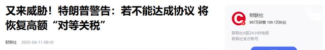 暂缓90天征税为美股带来生机,但特朗普紧接着又在周三发出威胁:如果你们不能和美国达成协议,那我不仅还会撤销暂缓,而且还会把关税提高到更高水平!