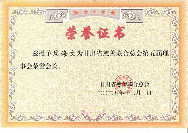 图为授予周海文为甘肃省慈善联合总会第五届理事会荣誉会长荣誉证书。
