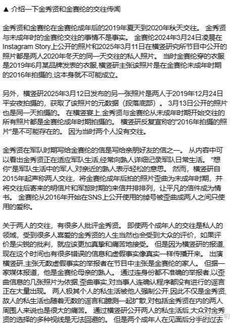此次事件的导火索源于一篇网络爆料,直指金秀贤与金赛纶的恋情始于金赛纶未成年时期。此消息一出,立即引发轩然大波,舆论哗然。众多网友纷纷表达震惊和质疑,担忧未成年人的身心健康和权益保护。然而,在事件持续发酵的过程中,我们也应保持清醒的头脑,切勿被情绪裹挟,盲目跟风。