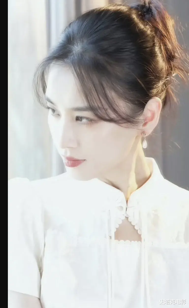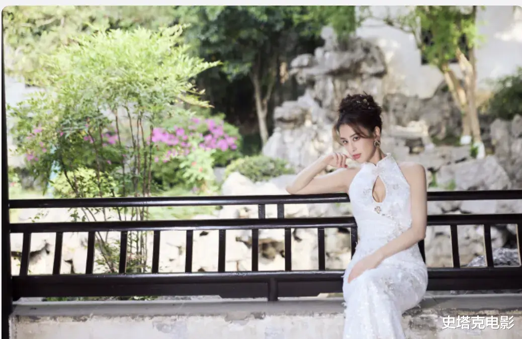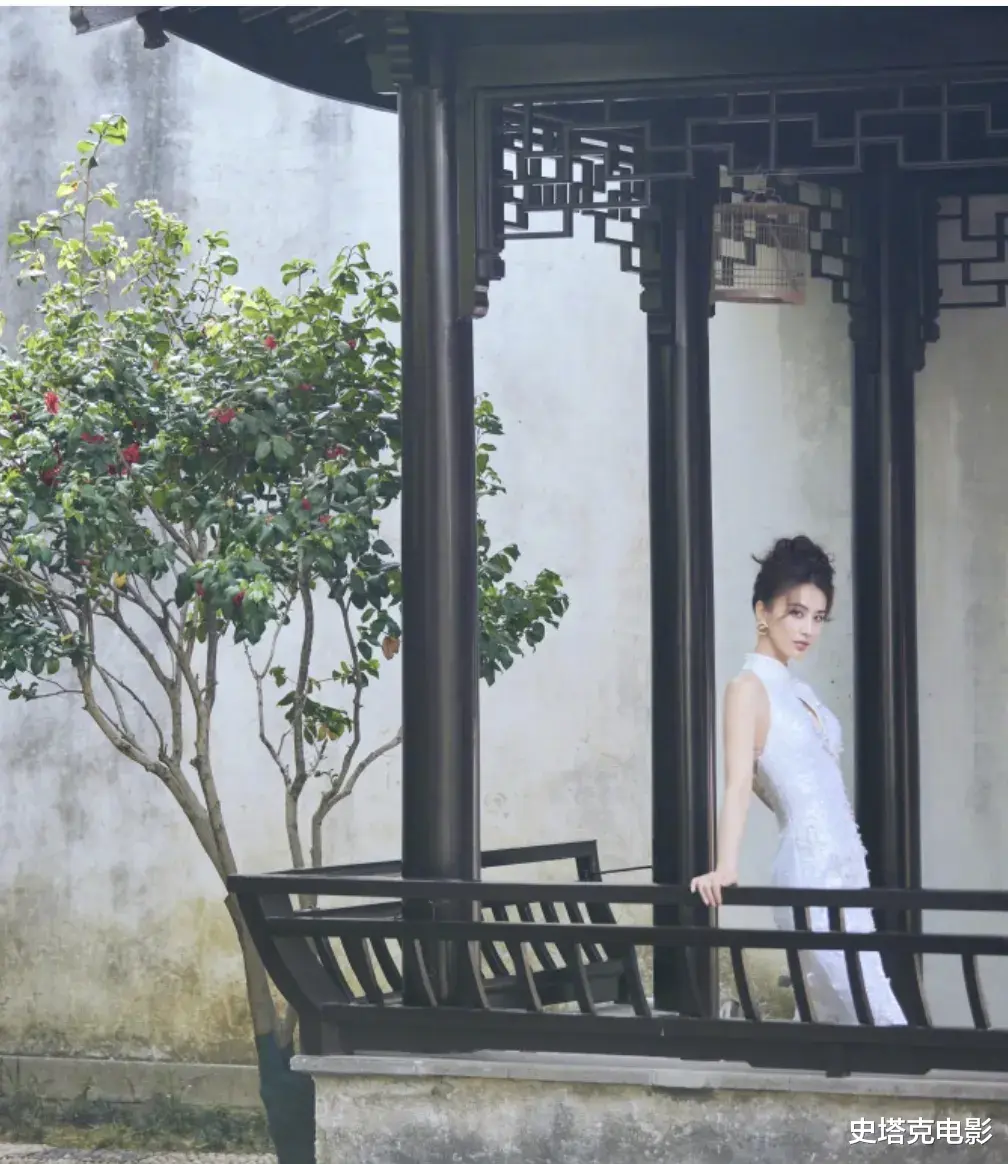 黄圣依穿着一件很白很素的旗袍在园林游玩,头发轻轻挽在脑后,高高的发髻很时髦,她坐在那里若有所思,还是很有意境和感觉的。