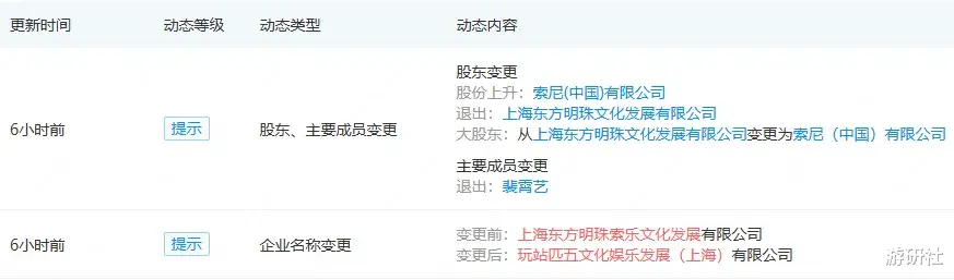 今日,据企查查信息显示,原上海东方明珠索乐文化发展有限公司发生工商变更,公司现更名为玩站匹五文化娱乐发展(上海)有限公司。原股东上海东方明珠文化发展有限公司退出,现由索尼(中国)有限公司全资持股。