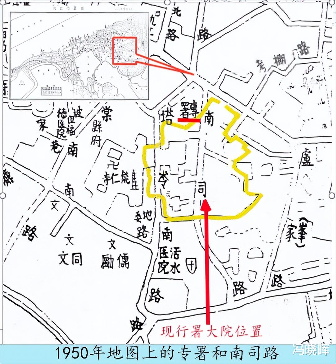 1949 年 5 月 17 日九江城区解放,7 月 6 日成立九江专员公署。当时的专员公署设在后来的大中路市粮食局内,该地面积较小,不敷使用,又迁扩到东面现大院,切断了民国时的南司路,增建了一些房屋和围墙。两块宽大的大门,用黑铁皮包裹,上面用大铁泡钉分别钉上“九江專署”四个大字。靠大门处还盖了一栋大礼堂,大礼堂的前面主楼为办公室,后面为两层的大会堂,除开大会使用外,有时也在此放映电影。