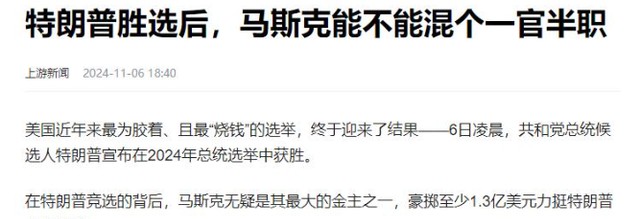这么多的资金,也让媒体一直在猜测,在特朗普当选后马斯克能不能混个一官半职。