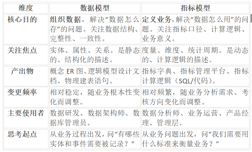 数据模型解决 “数据怎么存、怎么取” 的问题,指标模型解决“业务怎么量化、怎么评估” 的问题。具体来说,区别主要体现在这五个方面: