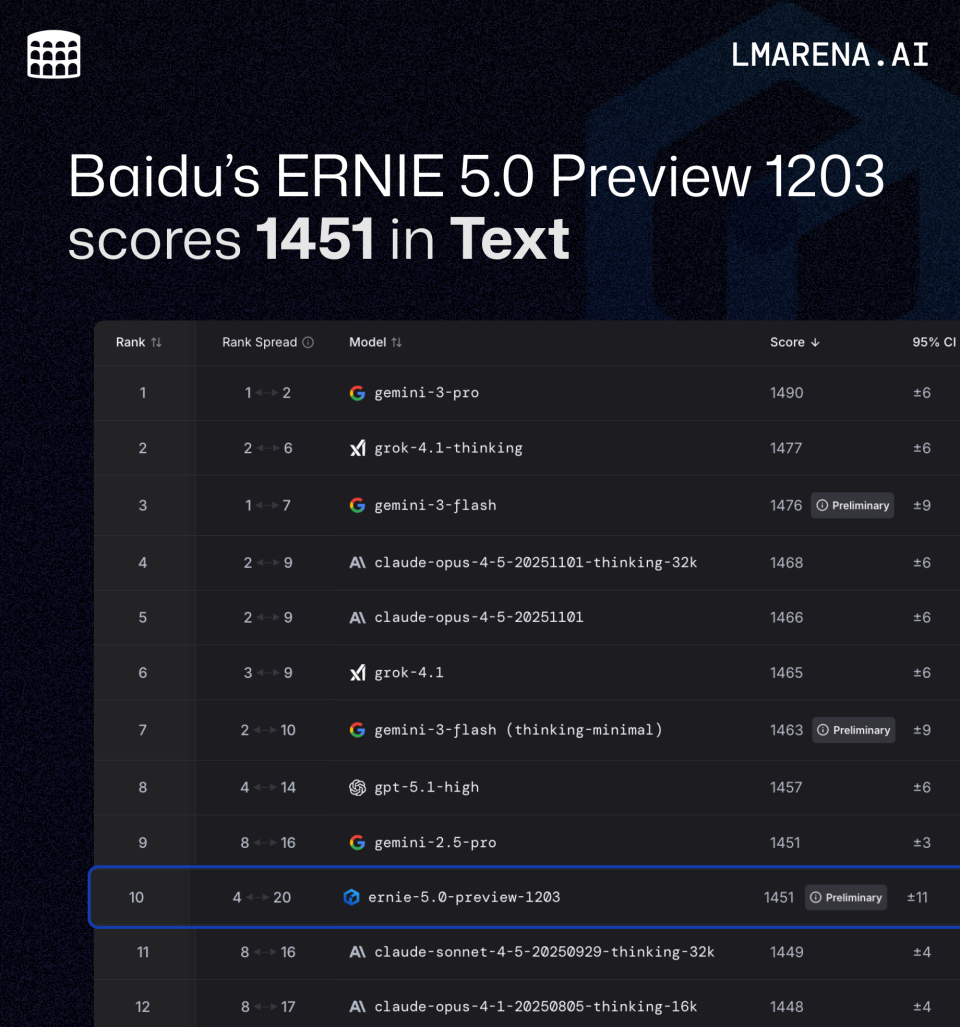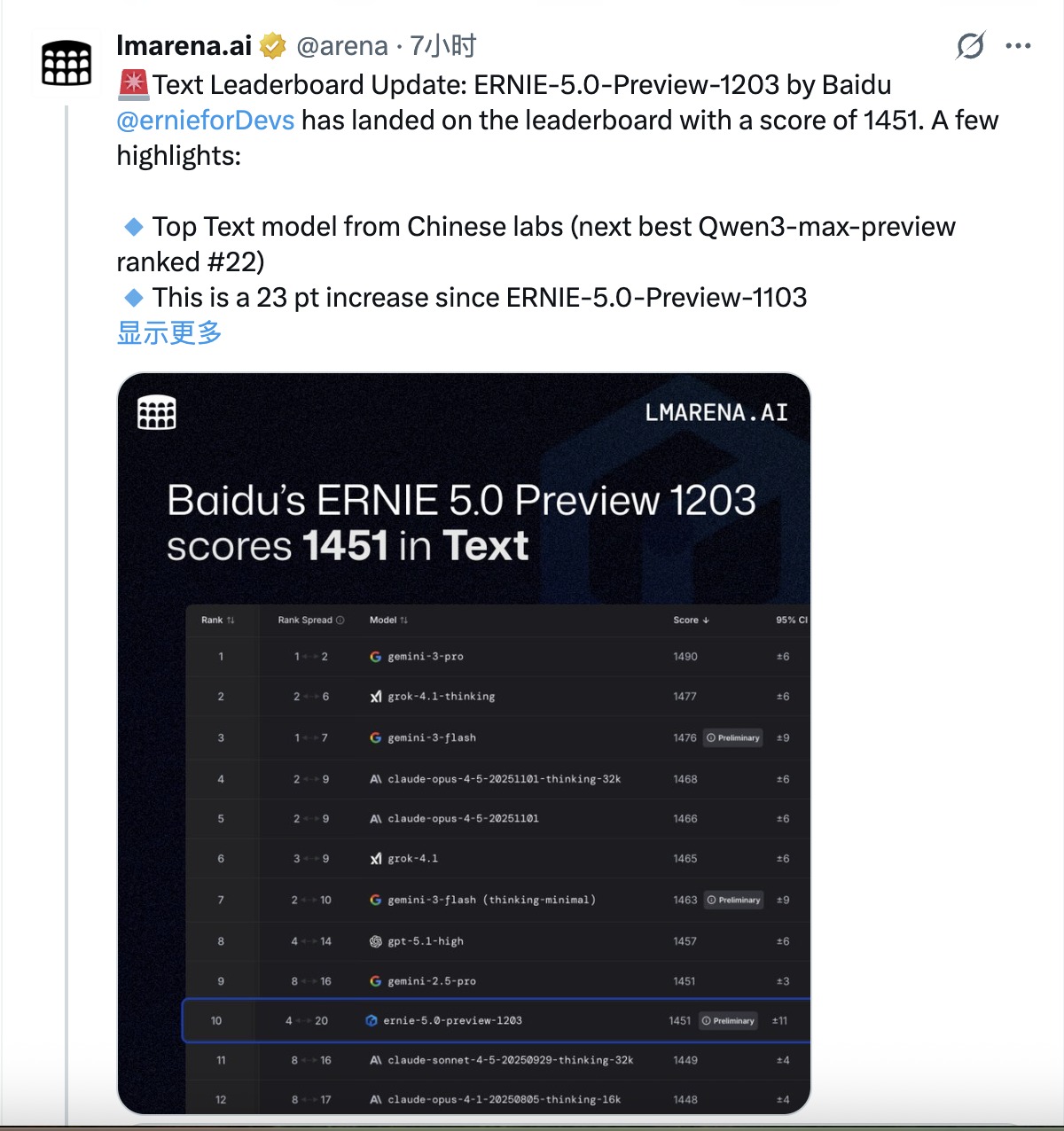 【全球AI竞争版图,正在迎来一位新王】全球AI领域的竞争版图,正迎来一场静水流深的重构。LMArena最新文本榜的揭晓,让文心新模型ERNIE-5.0-Preview-1203成为焦点中的焦点,不仅稳稳摘得了国内桂冠,更在国际同场竞技中力压不少国际知名模型,成为榜单前20名里独树一帜的非美国模型代表。这枚沉甸甸的“国内第一”,早已超越单纯的排名意义,成为中国AI产业从技术突围迈向生态自信的有力注脚。曾几何时,全球顶尖大模型的赛道上,中国力量的身影多处于追赶状态。国际评测体系的话语权长期被海外模型主导,国产模型即便偶有亮眼表现,也难改“单点闪光”的局限。但文心5.0系列的持续发力,正在彻底扭转这一局面,让中国AI从“被动对标”转向“主动定义”。短短两个月内,文心5.0的三次关键亮相,构建起一条清晰的“能力进化曲线”。11月初,ERNIE-5.0-Preview-1022首战LMArena文本榜,以全球并列第二、国内第一的成绩,在创意写作、复杂问题解构等核心场景站稳脚跟;11月下旬,ERNIE-5.0-Preview-1120出击视觉理解榜,拿下国内头名,能力水平与国际主流模型不相上下;如今最新版本再攀高峰,分数的稳步攀升背后,是模型在真实使用场景中解决问题能力的持续迭代,更是中国AI技术从“单点精进”到“系统成熟”的必然呈现。百度最近登榜这么频繁,很期待接下来是不是要有什么大动作了。从产品策略来看,文心5.0 Preview的网页端入口相对隐蔽,结合其2.4万亿的公开总参数量不难推测,高参数规模带来的算力成本压力,是百度未开放全民试玩的重要原因。这种克制的策略,本质上是为了优先保障关键业务与复杂任务的使用体验。这一选择也折射出大模型行业的发展新趋势:头部模型更聚焦于核心任务的稳定运行,当前稀缺的不是模型本身,而是高质量数据与真实落地的业务场景,行业竞争逻辑也已经转向“拼稳定性、拼成本结构、拼真实业务ROI”。文心5.0 Preview在LMArena的脱颖而出,恰恰说明国产大模型已经真正走进“以业务价值为核心”的发展新阶段。它打破的不仅是国际模型的垄断格局,更搭建起中国AI与全球对话的技术桥梁。当国产模型能够在全球公认的权威平台上,以实力赢得广泛认可,便为整个中国AI产业生态赢得了更广阔的发展空间,也让更多国产技术、国产应用获得“走出去”的信心与底气。更值得期待的是,当前的亮眼表现还只是“预览版”的实力展露。有消息称文心5.0正式版预计在明年1月上线,中国AI大概率也即将迎来一次全面的能力升级。从“跟跑”到“并跑”再到逐步“领跑”,文心大模型的成长轨迹,正是中国科技产业厚积薄发、自主自强的生动写照,更是中国AI生态从“技术突围”到“价值引领”的缩影。在全球科技竞争日趋白热化的当下,文心5.0的每一次突破都在传递一个清晰信号:中国AI的发展,早已超越“追赶他人”的初级阶段,进入“构建自身生态、创造独特价值”的全新征程。当越来越多的国产大模型以自主创新为根基,在全球舞台上发出中国声音,不仅将为智能时代的全球发展注入多元动能,更将书写属于中国科技的“价值创造”新篇章。#百度# #文心一言# #文心# #文心大模型# #ai# #AI大模型# #科技# #AI技术# #干货分享#