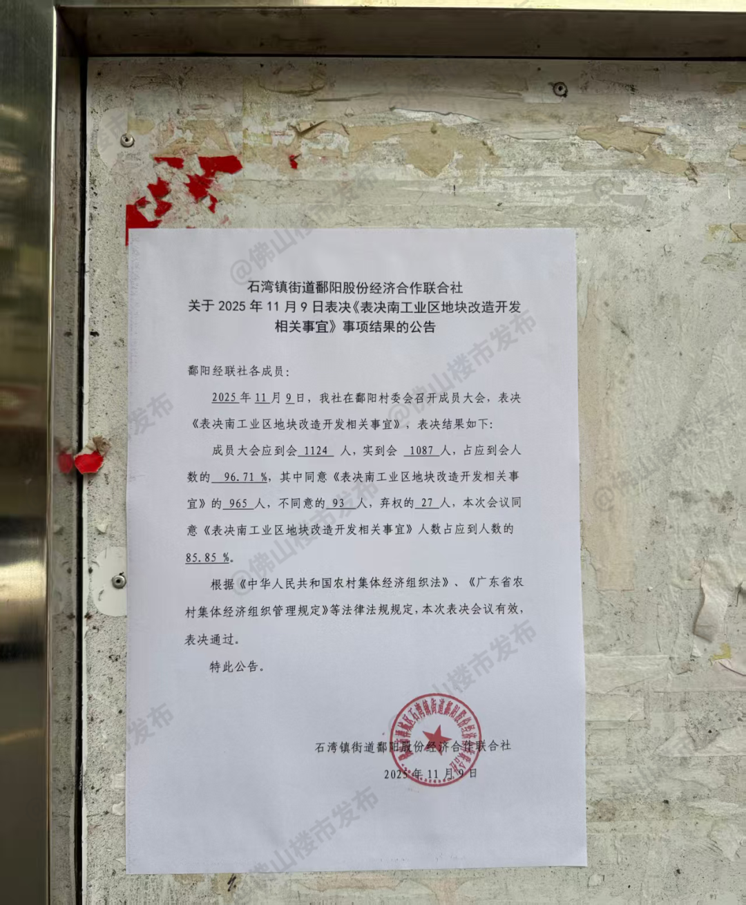 2025年11月9日,鄱阳经联社在鄱阳村委会召开成员大会,表决南工业区地块改造开发相关事宜,表决通过。