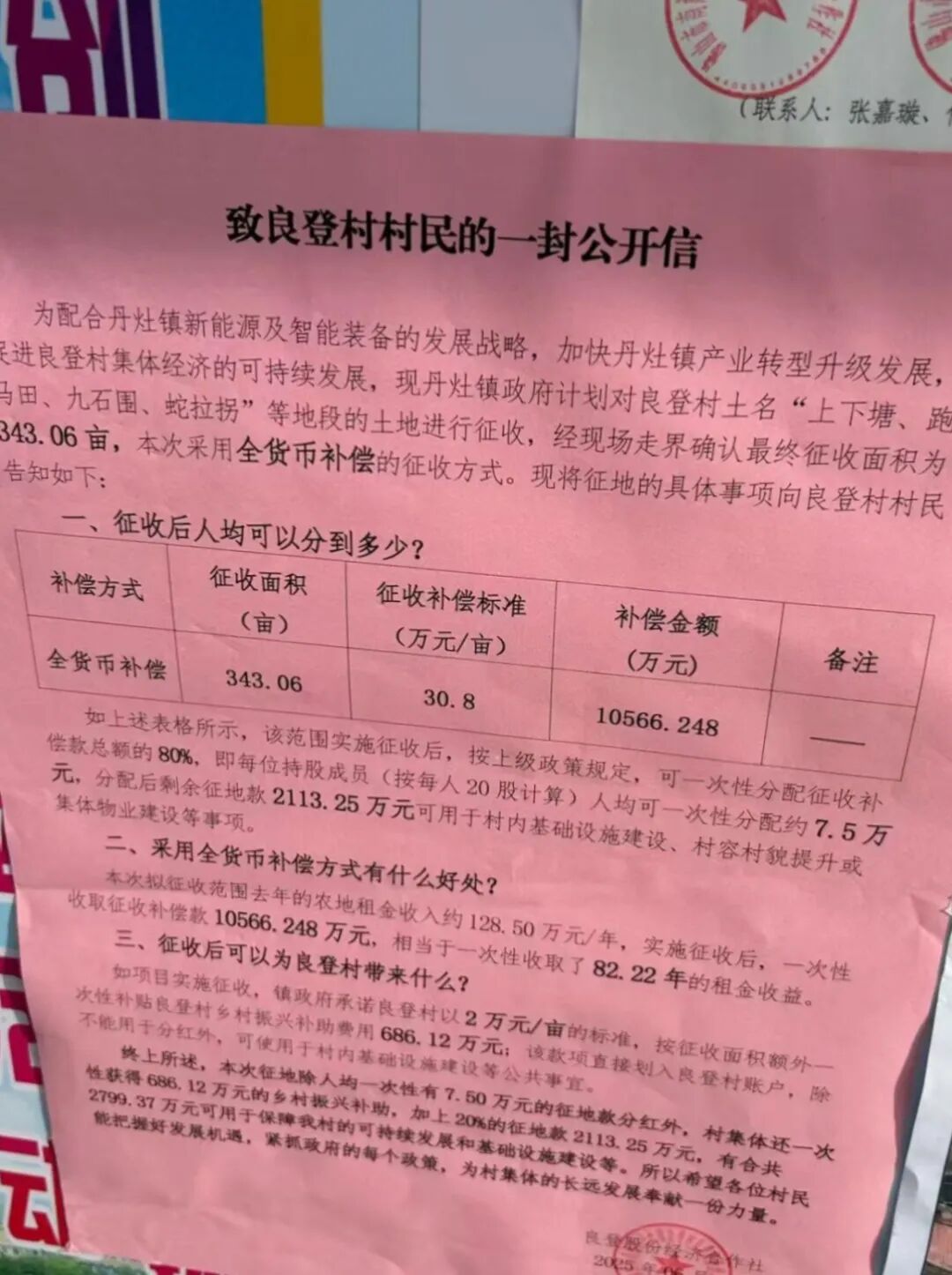 2025年6月,有网友在社交平台爆料自己所在的丹灶镇良登村因土地征收将迎来集体分红!并表示自己家就能拿到30万。图片显示,土地征收地段为“上下塘、跑马田、九石围、蛇拉拐”,拟征收面积343.06亩。采取全货币补偿,补偿标准30.8万元/亩,补偿金额达到10566.248万元,每位持股成员(按每人20股计算)人均可一次性分配约7.5万元。以拟征收范围去年的农地租金收入为准,相当于一次性收取了82.22年的租金收益。