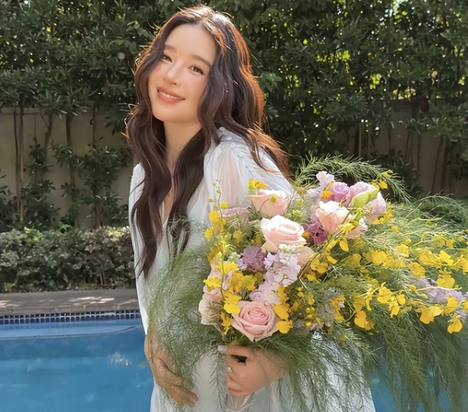 她身着宽松的白色连衣裙,一只手捧着淡粉色的郁金香,另一只手搭在明显隆起的腹部。
