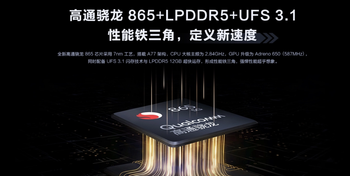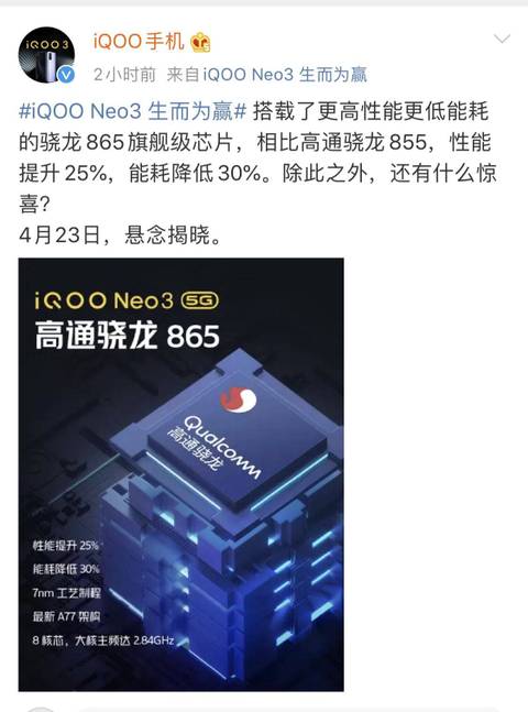 iQOO官方微博在4月13号宣布iQOONeo3确定于4月23日发布,此次备受关注的iQOONeo3相比于iQOONeo的骁龙855处理器直接搭载了骁龙865处理器,骁龙865采用7nm工艺制程以及最新的A77架构,同样是8核心,比起iQOONeo主核CPU频率可达到2.84GHz,相比于iQOONeo性能提升25%,功耗降低30%。