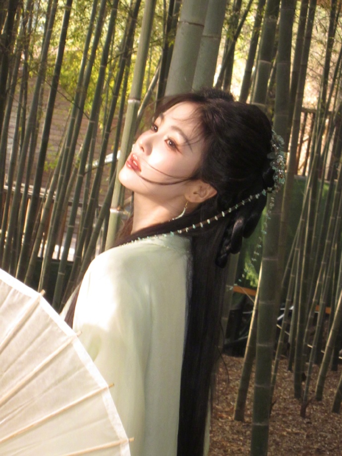 后来拢了把白伞在手里,伞骨的竹纹和身后竹身凑成呼应,她低头往伞沿躲了躲光,编发的细辫垂在伞面,连发丝的弧度都跟着软 ,是突然被阳光晃了眼,随手抬伞的自然,比戏里的身段多了点烟火气。