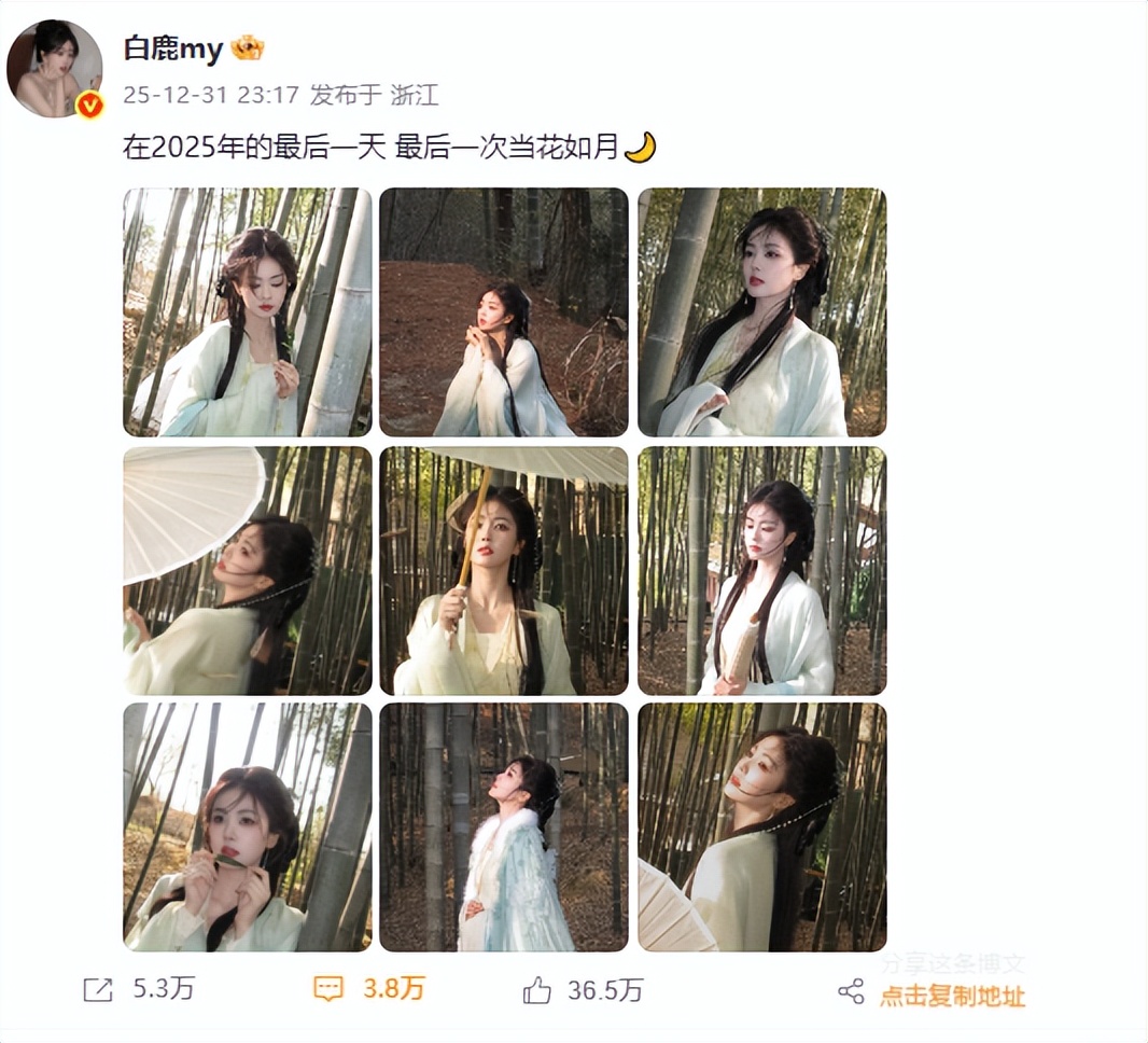 跨年夜的社交平台裹满了烟火气,白鹿却扔出句 “在 2025 年的最后一天最后一次当花如月”,跟着的九宫格全浸在竹林的暖光里:浅纱衫、编发、竹影,是把戏里的 “花如月”,妥帖留在了岁末的林子里。