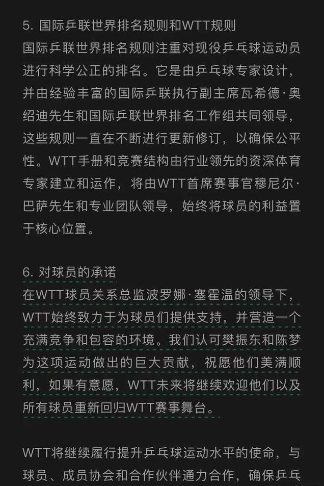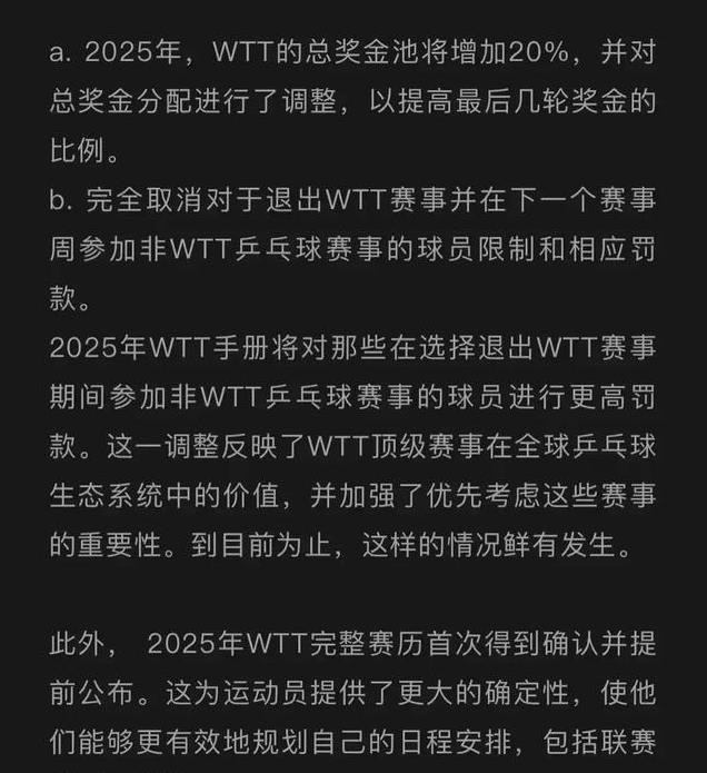 次日,WTT世界乒联迅速作出回应,称这一规则早在4年前成立时就已经存在,并非针对他们二人临时出台。而且官方还发文称,2025 WTT 总奖金池会提高 20%。