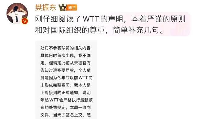 对此樊振东于 12月29日再次发文,他在文中指出,自己此前从未被官方告知过退赛要罚款的规定,直到上周才接到正式通知。而且,WTT所说的规则早在4年前就已经出台的说法,也与樊振东所了解的情况完全不符。