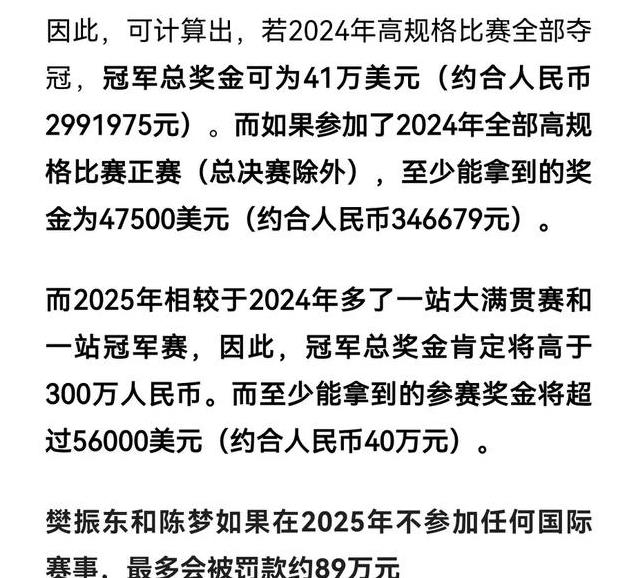 根据无聊网友计算,如果 2025 年樊振东参加 WTT 全部大赛并且夺冠最高可以拿到大约人民币 346 万元,而樊振东如果整年不参赛,将面临 89 万元的罚款!
