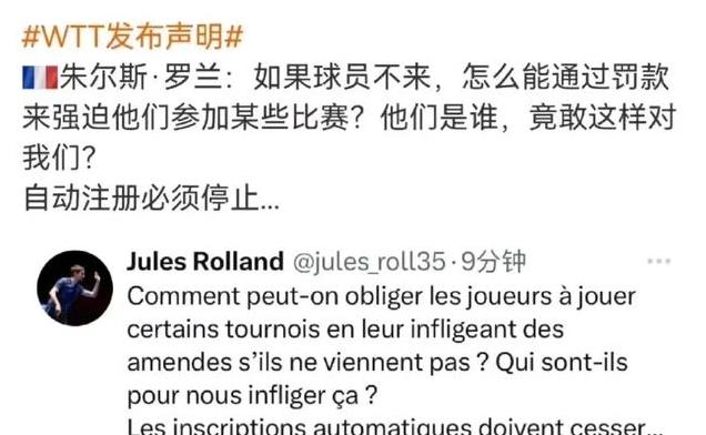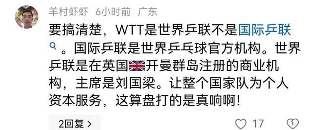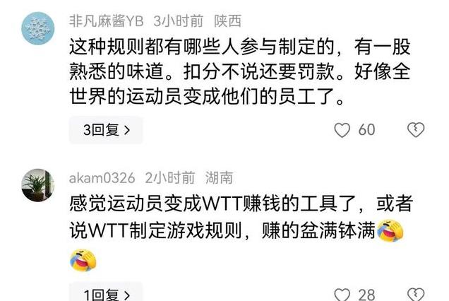 有网友对 WTT 官方提出了质疑,认为 WTT 官方并不能代表国际乒联,国家运动员不该被资本裹挟,成为资本赚钱的工具。