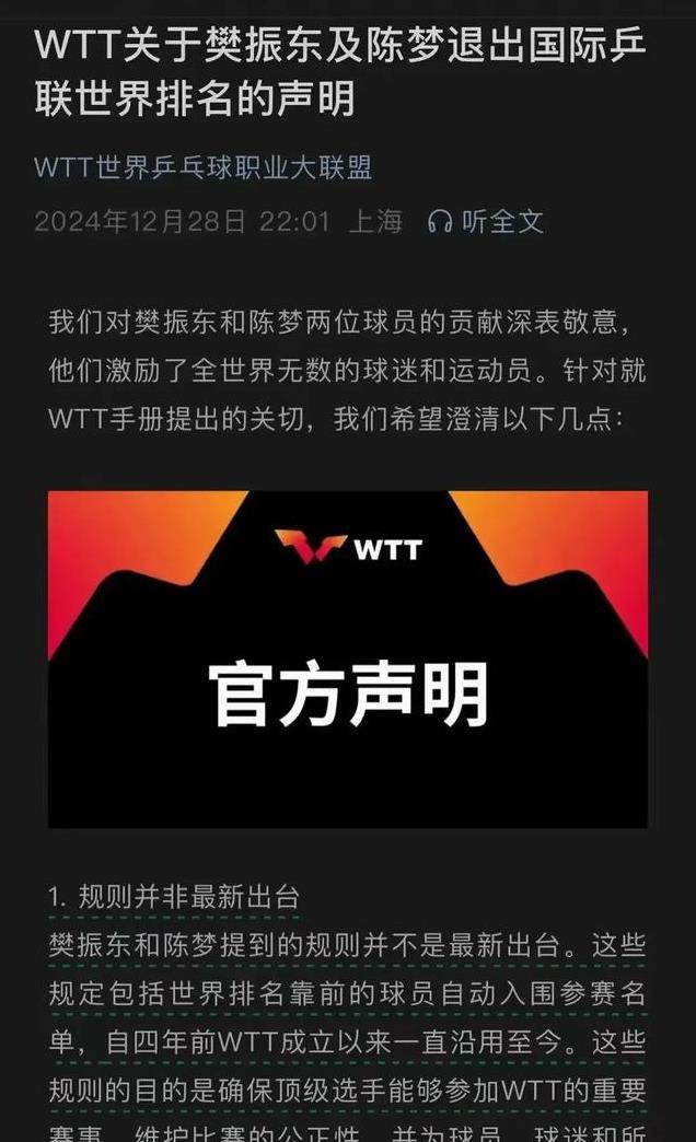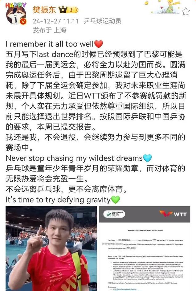12 月 27 日,樊振东、陈梦先后微博发文称将退出世界排名,两人给出的理由大致相同,均是因为 WTT 官方新规定不参赛即罚款,而樊振东和陈梦因各种原因,2025 年的职业生涯尚未规划,所以为了避免罚款,无奈只能提交退出世界排名申请。