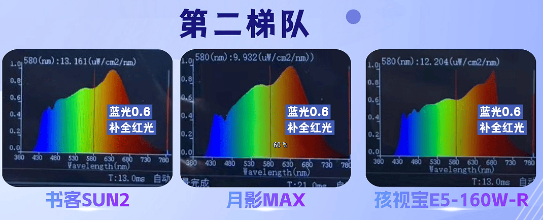 其次是低蓝光且补全红光的书客SUN2、月影MAX、孩视宝E5-160W-R,这三款护眼大路灯实际蓝光都在0.6左右,但是孩视宝E5-160W-R这款护眼灯红光峰值非常突出,虽然低蓝光,但是有益蓝光以及短波绿光含量减少,实际光谱分布并不接近太阳光。