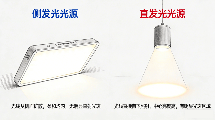 ③眩光控制效果不同:直发光若未优化遮光与扩散结构,直接从光源发出的光线更容易进入眼睛视野中心,增加眩光风险,而侧发光通过导向和遮光设计,将直射光减少、将不必要的强光引导到桌面,从而有效降低眩光感,改善用眼体验。