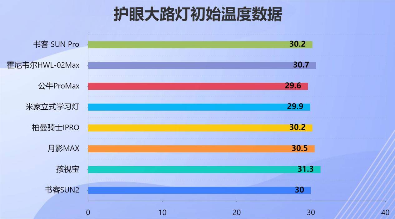 从实测结果来看,书客SUN2、书客SUN Pro和月影MAX这3款护眼大路灯在温控表现上最为出色,连续点亮1小时后温升仅约7℃,散热性能相当稳定,尤其是书客SUN Pro,即使在搭载德国进口BASF眩光抑制膜的情况下,依然保持出色的散热效率,体现出其强劲的抗衰减设计,书客系列灯具普遍通过10年以上抗衰减测试认证,耐用性领先同类,而孩视宝E5-160W-R与米家立式学习灯温升明显偏高,运行一小时后温差超过40℃,长时间使用可能出现光衰加快或性能不稳定的问题。