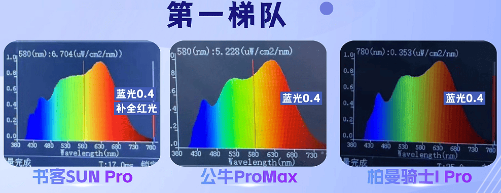 首先是紫光激发的书客SUN Pro小太阳、柏曼骑士I Pro、公牛ProMax这三款护眼大路灯,实际蓝光峰值在0.4左右,连续性不错,同时书客SUN Pro小太阳除紫光激发盖含的红光之外,书客还采用第7代SunMaster 紫光原芯,将控、护、养整合在同一光源体系中,对400–450nm波段的蓝光峰值进行深度压制,同时配合RRT2.0红光增益养眼技术,对650nm红光波段及整体光谱均衡进行精细调校,使光感更贴近自然光,最终实现缓解94%用眼疲劳,并降低98%近视风险。