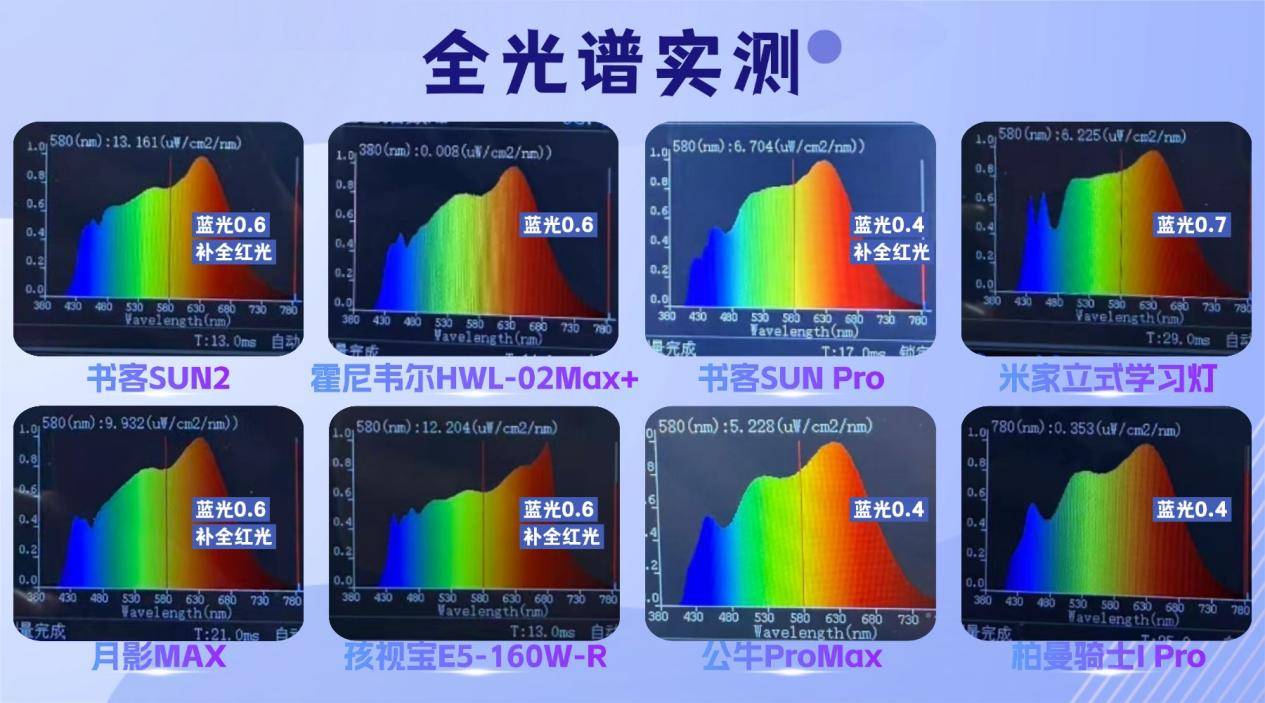 建议选择低蓝光且补全红光的全光谱护眼灯,从实测来看,其中书客SUN Pro小太阳、柏曼骑士I Pro、书客SUN2、月影MAX这几款表现不错。