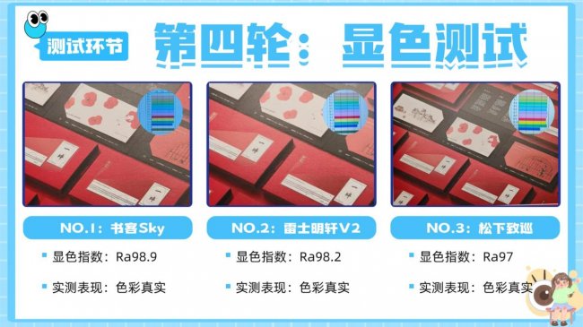 松下致巡显色指数Ra为97,能稳定满足日常基础读写的色彩识别需求,无明显偏色问题,表现中规中矩。雷士明轩V2显色指数Ra为98.2,基础色彩还原能力不错,能满足适合普通阅读、办公等日常使用场景,表现稳定可靠。
