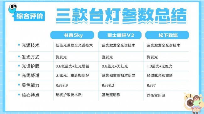 三、综合评价与选购指南从光谱安全、光线舒适度到视觉细节表现,三款护眼台灯在核心能力上的差异还是比较明显的: