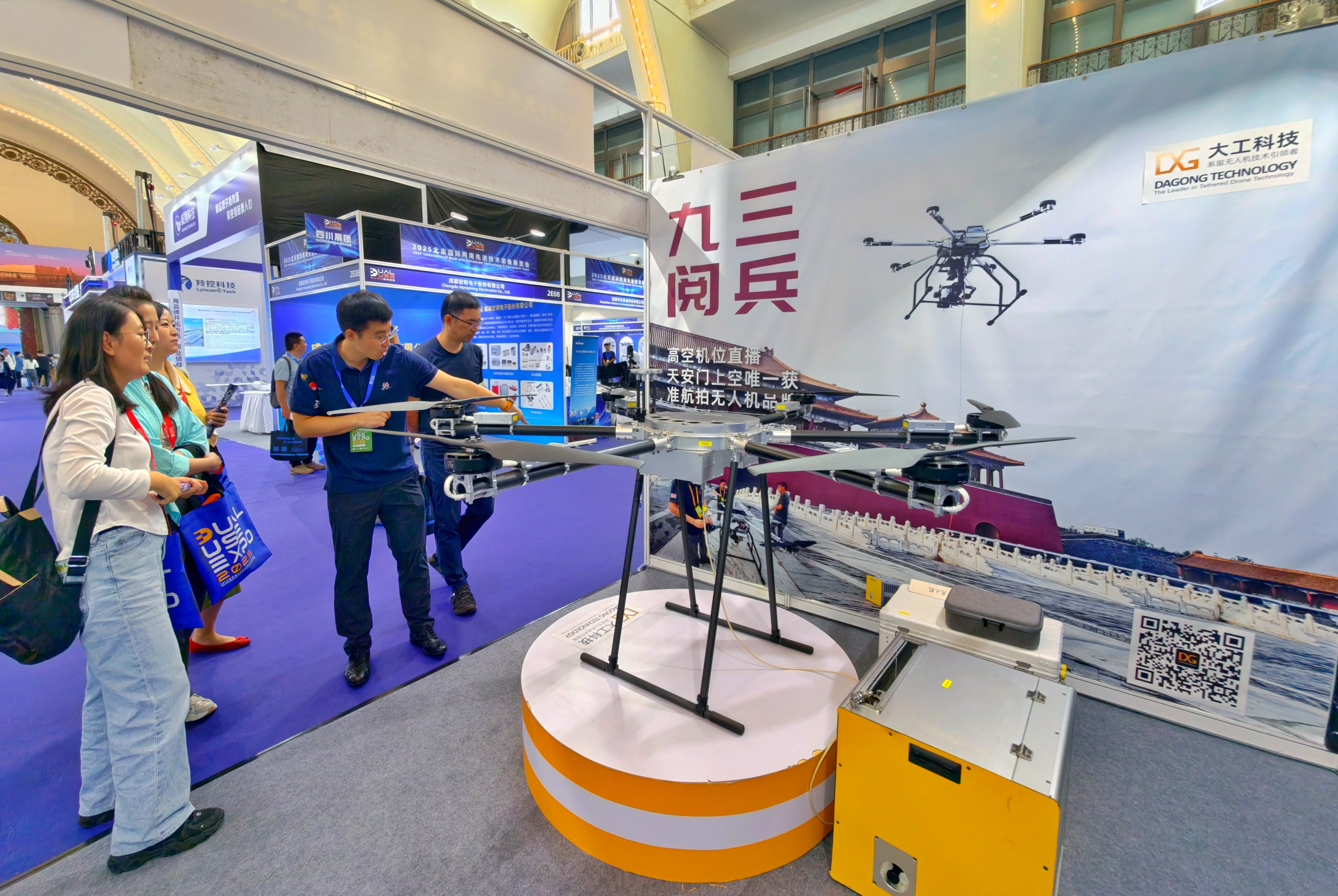 九三阅兵活动中在天安门上空航拍的无人机品牌北京大工科技有限公司也在展会亮相,无人机搭载的高清摄像机以独特视角定格下震撼人心的历史瞬间。