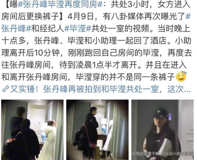到了2019年,媒体再次拍到了张丹峰与毕滢酒店共度一夜的画面,大约10点两人回到酒店,毕滢从电梯出来就直接进了张丹峰的房间,进去没多久毕滢出来回自己房间,待了一会儿再出来后换上了一套家居装扮,再次去了张丹峰的房间,而这一去直到凌晨1点多,她才回到自己的房间,两人共度良宵被拍实锤。