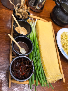 主打正宗山东煎饼,源自鲁南风味,不涉及海鲜。选用优质杂粮磨制面糊,摊成薄而有韧性的煎饼,搭配新鲜大葱、蘸酱、馓子,卷起来一口下去,煎饼的醇香混合着大葱的清香和馓子的酥脆,咸香可口,越嚼越香,是山东人日常的经典小吃,做法简单却藏着最纯粹的鲁地风味。
