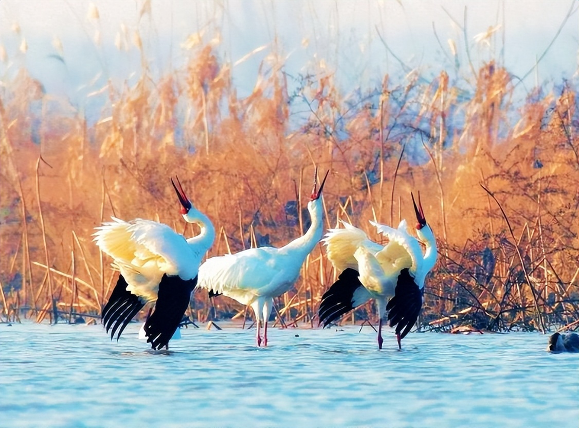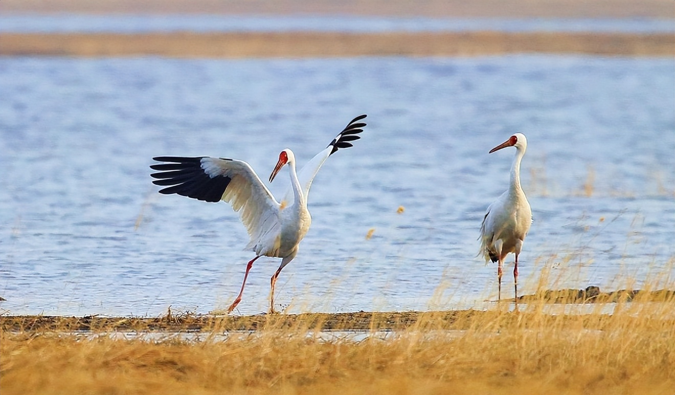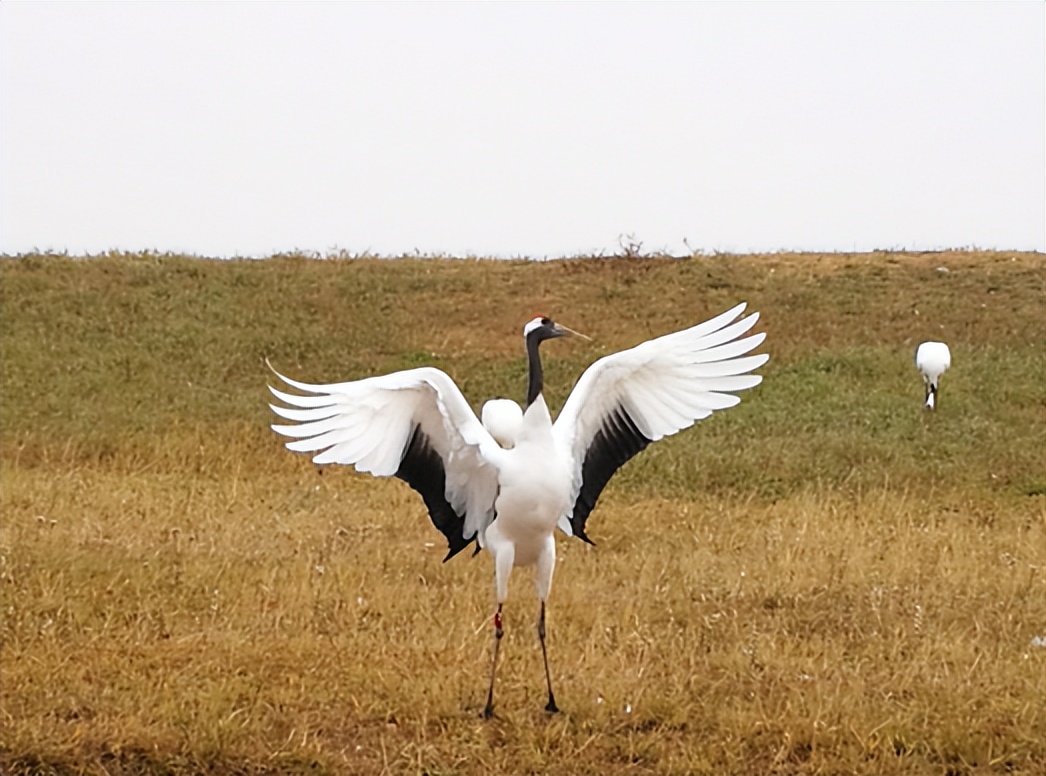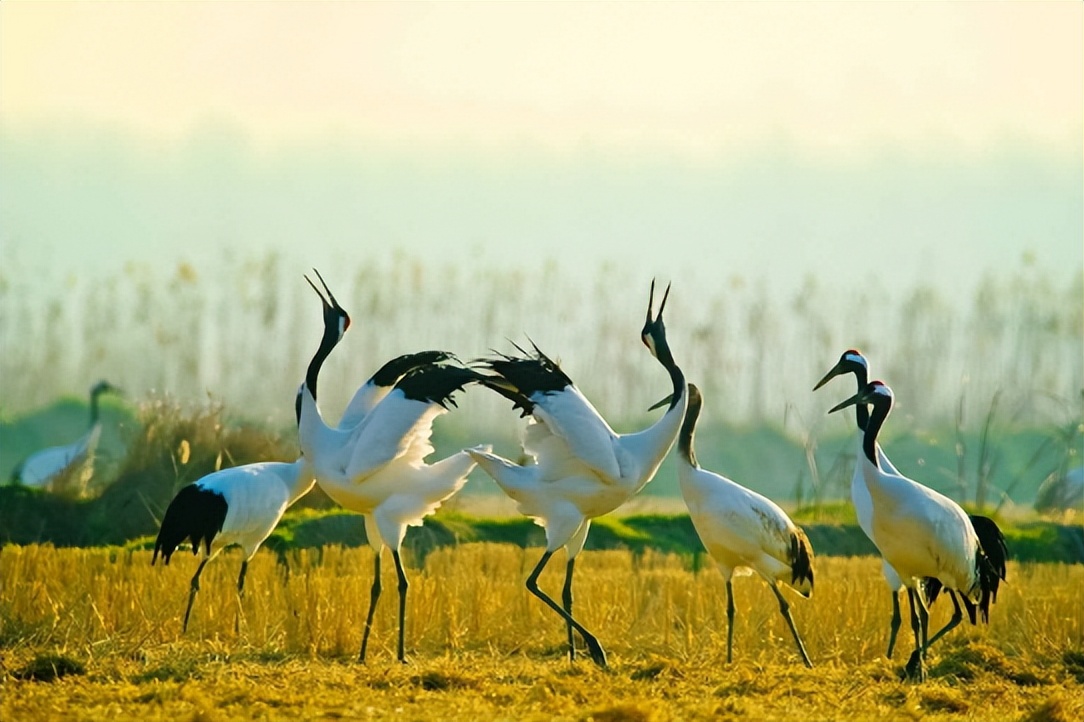一旁的白鹤也是伸着长长的脖颈看着同类,目光中充满向往。